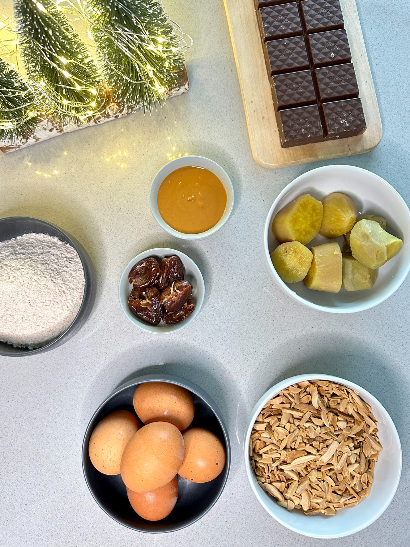 5. Num processador, coloque a manteiga de amendoim, 4 tâmaras, o ovo, o chocolate derretido, a batata doce, a farinha, o fermento, a canela e a noz-moscada. Triture.
