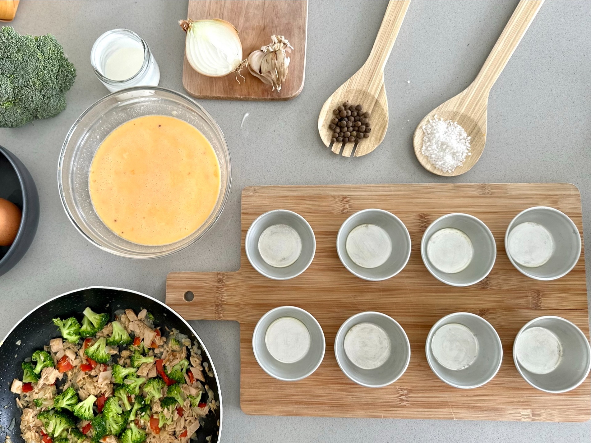 7. Distribua o preparado de atum pelas formas de muffins e cubra com o preparado de ovo.