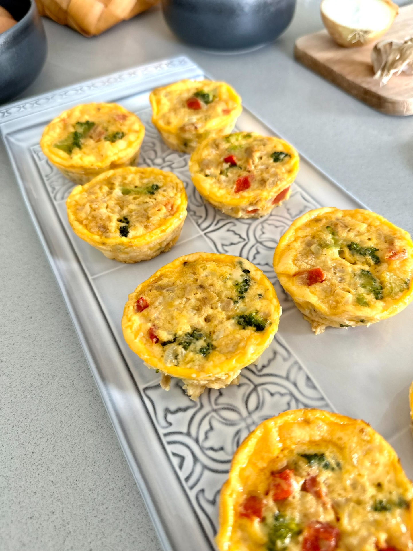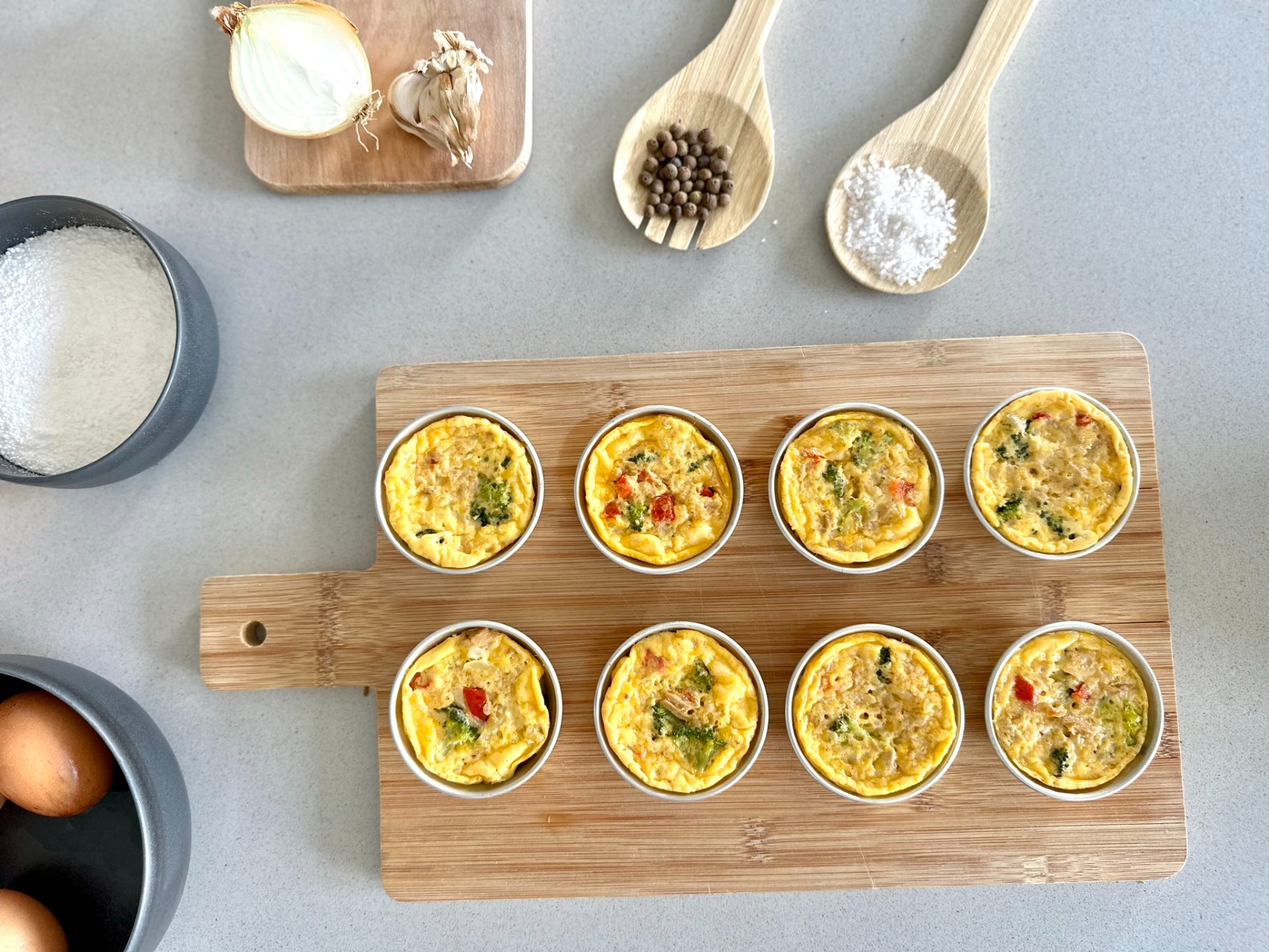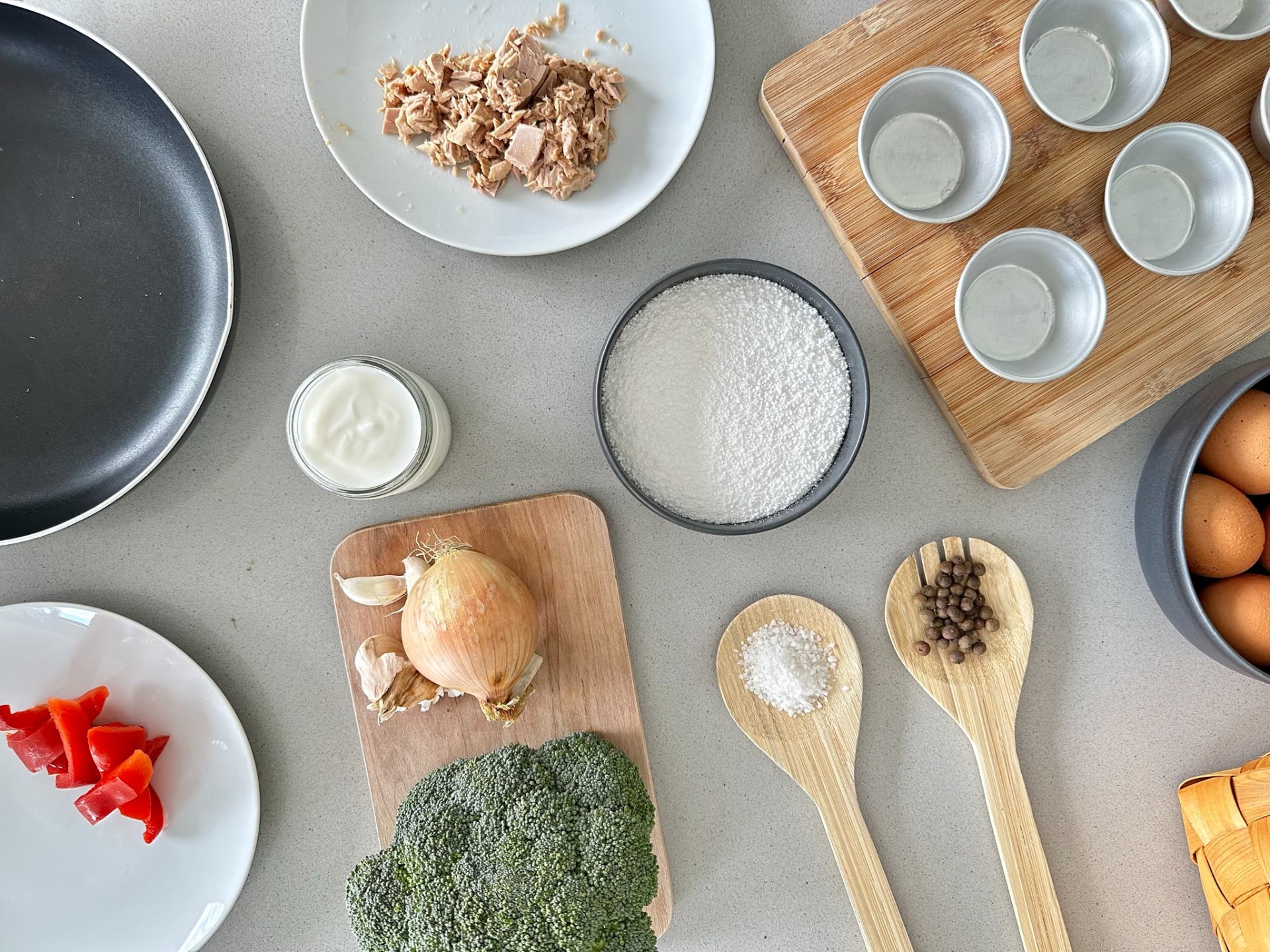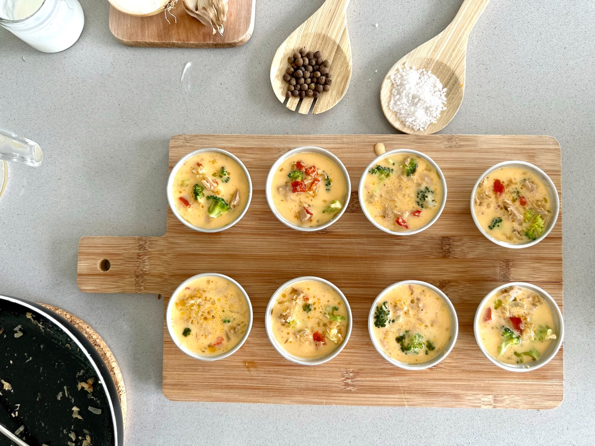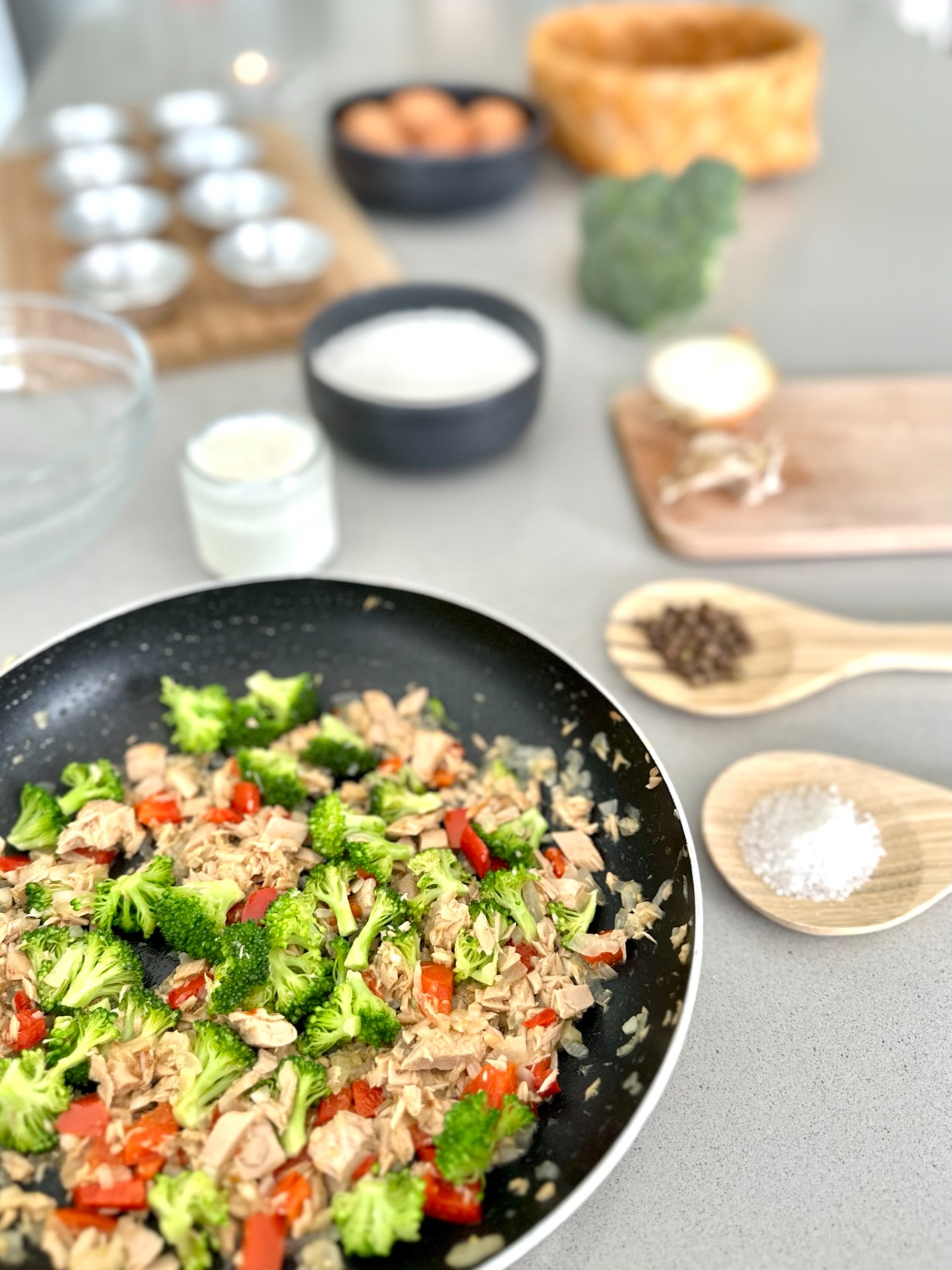 7. Distribua o preparado de atum pelas formas de muffins e cubra com o preparado de ovo.